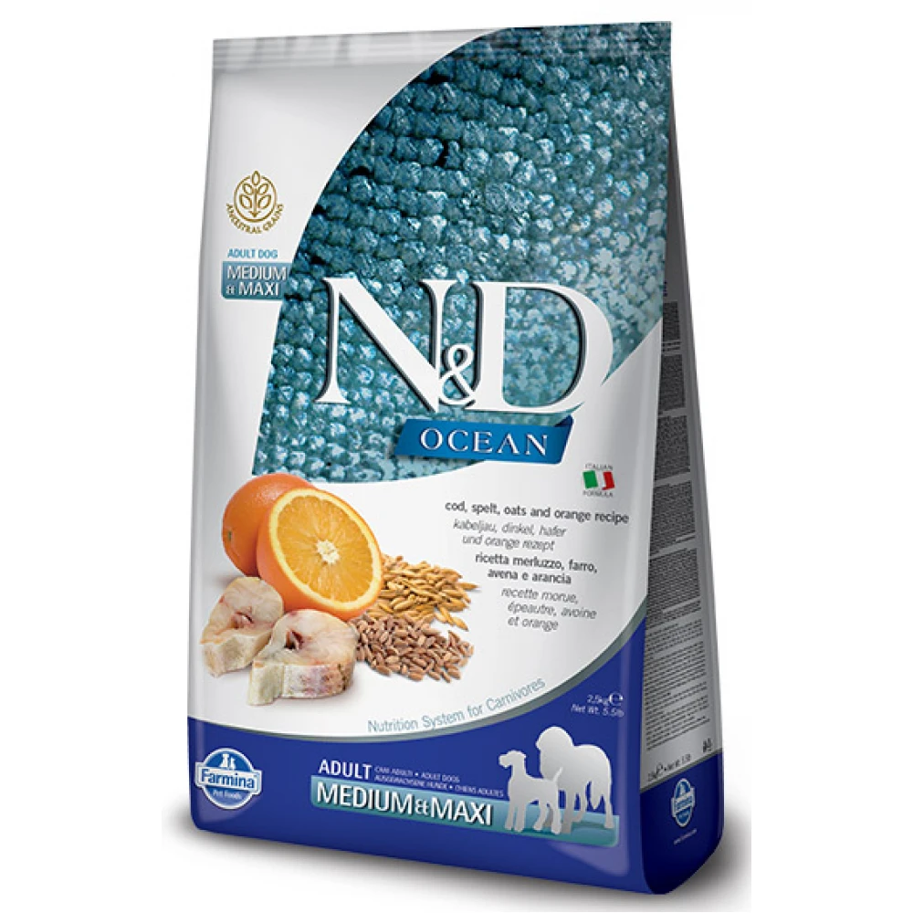 Ξηρά τροφή σκύλου Farmina N&D Ocean Low Grain Cod & Orange Adult Medium & Maxi 12kg με Μπακαλιάρο και Πορτοκάλι.Για μεσαίου και μεγάλου μεγέθους σκύλους.