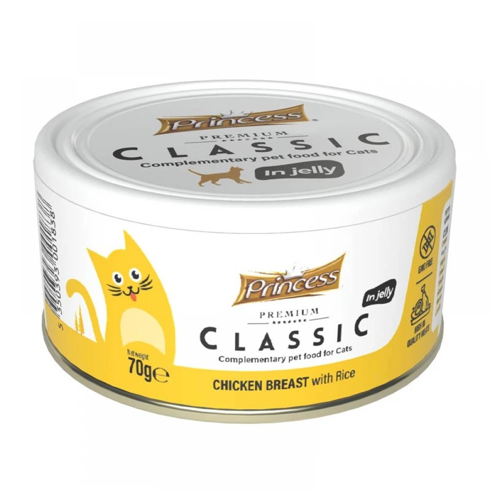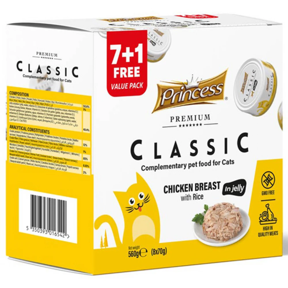 Υγρή Τροφή, Κονσέρβα Γάτας Princess Premium Classic Chicken Breast with Rice 70g (7 + 1 Δώρο).