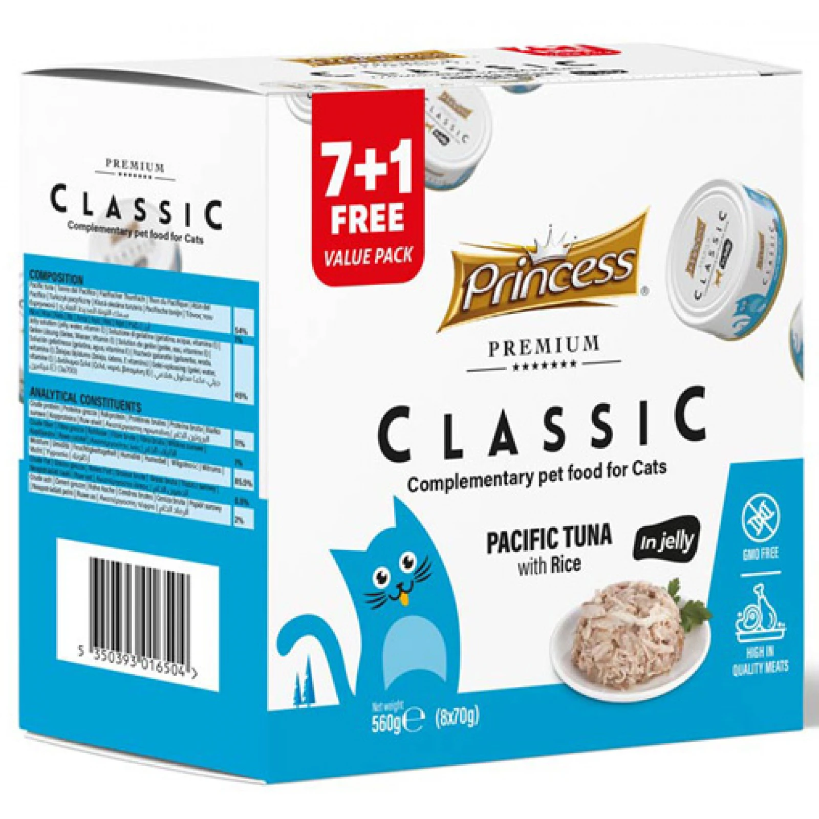 Υγρή Τροφή, Κονσέρβα Γάτας Princess Premium Classic Pacific Tuna with Rice 70g (7 + 1 Δώρο).